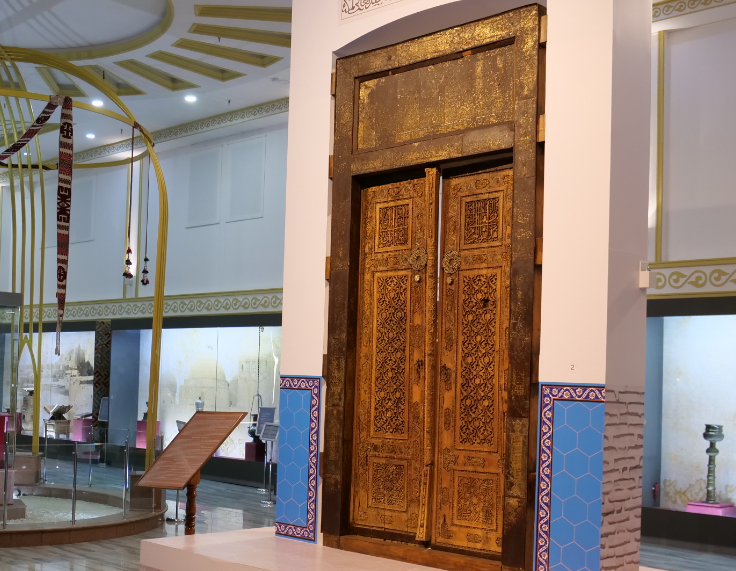 Кесенедегі XIV ғасырдан сақталып келе жатқан екі есіктің бірі қабірхана есігі. Бұл есік орта ғасырлық оюлы есіктердің тамаша үлгісі болып табылады. Есік екі жақты ашылады, ұсақ сүйектермен әшекейленіп ергенектері қаңылтырмен қапталып ондағы жазулар алтынмен апталған. Бұл есіктегі араб және парсы тіліндегі жазуларды алғаш толық оқып, ғылыми түрде сипаттап, қазақ тіліне аударған – мәтінтанушы ғалым Сайпулла Моллақанағатұлы. Есіктің жоғарғы жағындағы екі шаршының ішінде ойылып өрнектелген гүл мен жапырақтардың арасында сулус қолтаңбасымен жазылған Пайғамбардың (ғ.с) хадисі орын алған. Есіктің ортаңғы бөлігінде, жарты бағанада куфа қолтаңбасымен парсы тілінде жазылған жазу: «құтты болсын», — деген сөз. Есіктегі екі қола пластина бетіндегі айналдырыла сульс қолтаңбасымен жазылған жазулар бар. Ал есіктің ергенегіндегі қапталған қаңылтырдағы жазулар есікті айналдыра геометриялық медальондар ішіне сулус қолтаңбасымен жазылған.