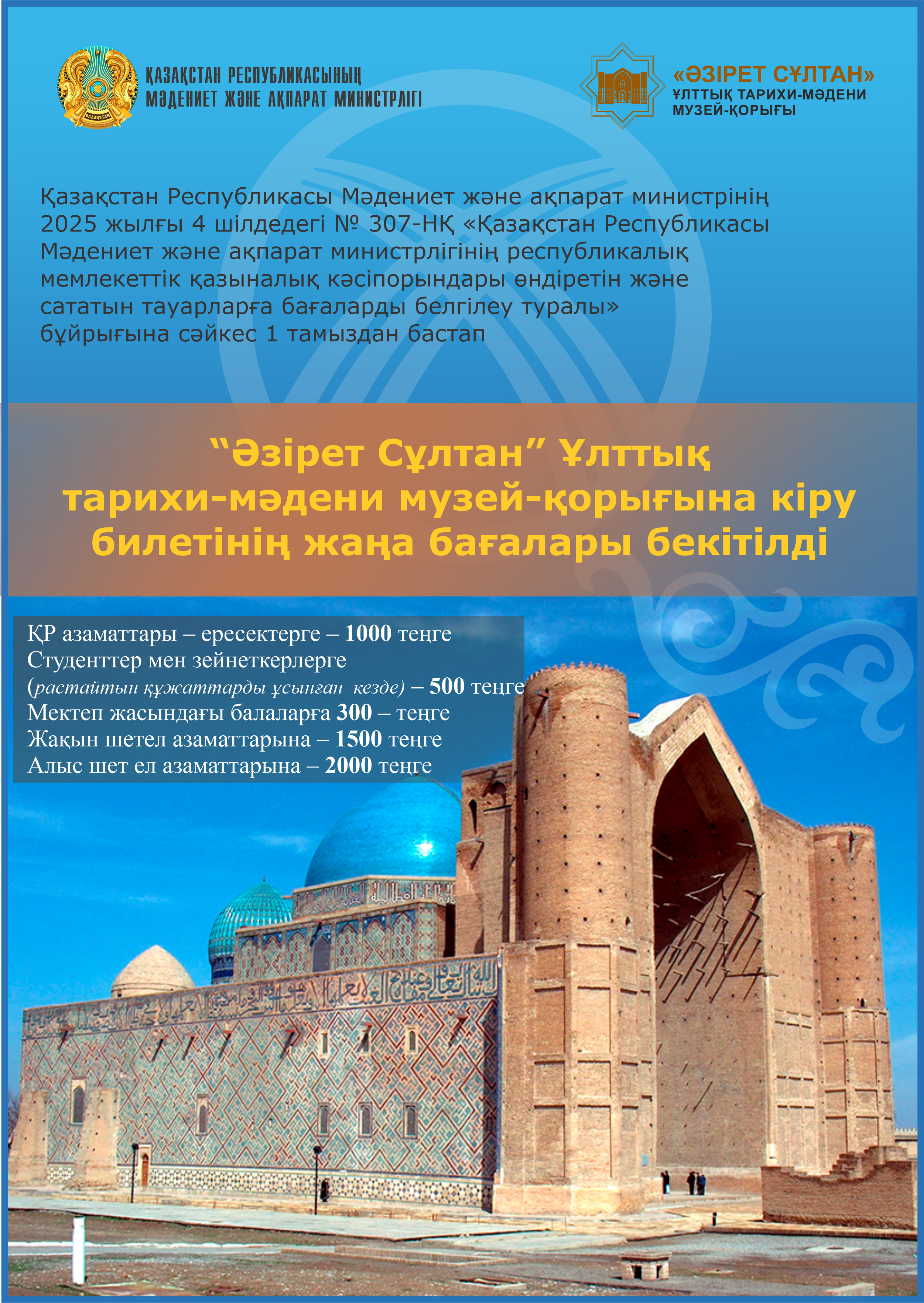 In light of this, under Order No. 307-NҚ issued on July 4, 2025, by the Minister of Culture and Information of the Republic of Kazakhstan “On setting prices for goods (works, services) produced and sold by Republican State Treasury Enterprises under the Ministry of Culture and Information”, the updated ticket prices for entry to the reserve-museum are as follows: