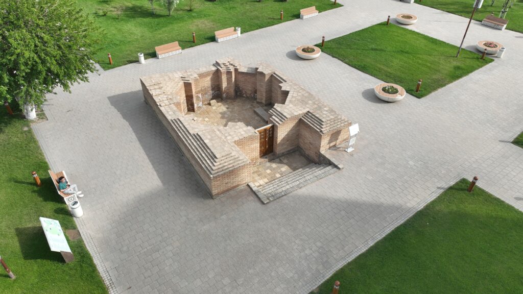 The mausoleum’s final height reached only about 6.9–7 meters. It was topped with a single dome, while the portal reached approximately the same height. Construction began shortly after Tauke Khan’s death, and later his sons were also buried here — Bolat Khan, who died in 1727, and his younger son Sameke Khan, who died in 1738. In 2020, restoration works were carried out by Kazrestavratciya, during which the mausoleum walls were raised to a height of 2.5 meters.