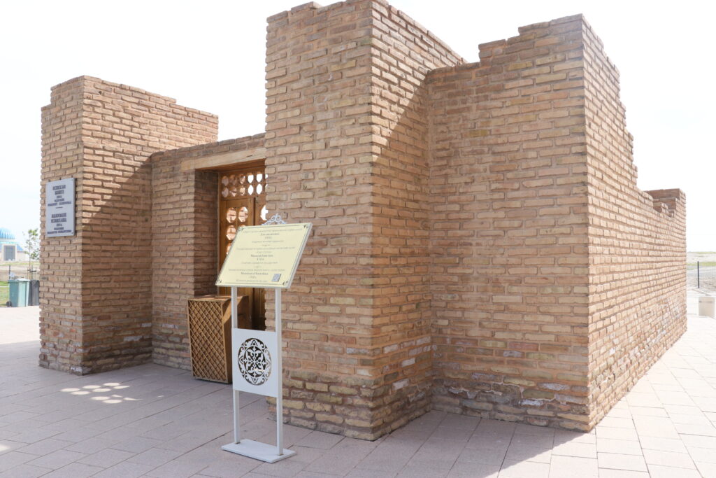 The Mausoleum of Yesim Khan is located 12 meters southwest of the southern tower of the Mausoleum of Khoja Ahmed Yasawi. It is a monument of national significance. Coordinates: 43˚17.835΄, 068˚16.275΄ This medieval architectural monument has been partially restored. The height of the tomb is 3.2 meters, and its width is 8.9 meters. Yesim Khan was a prominent political figure in the medieval Kazakh Khanate. In the memory of the Kazakh people, he remains an enduring symbol of courage, often referred to as “Yesim the Tall and Brave”. He passed away in 1628. In 1960, archaeologist G. I. Patsevich was the first to identify this burial site as the “Tomb of Yesim Khan”. Architecturally, the mausoleum is a modest square-shaped structure. Its main façade has been preserved in the form of a portal, adorned with glazed tiles featuring geometric patterns. The floor is laid with square bricks. No traces of plastering were found on the walls or the dome of the burial chamber (sagana). The preserved structural elements of the mausoleum reflect widespread funerary construction techniques typical of the region. The upper part of the structure was completely destroyed, and only the lower burial chamber (murdekhana) has survived. The first archaeological study of the mausoleum was conducted in 1958. Partial restoration was carried out in the 1980s. In 1994, the mausoleum was included in the Register of Historical and Cultural Monuments of Kazakhstan (South Kazakhstan Region edition) under number 590.7 and placed under state protection.