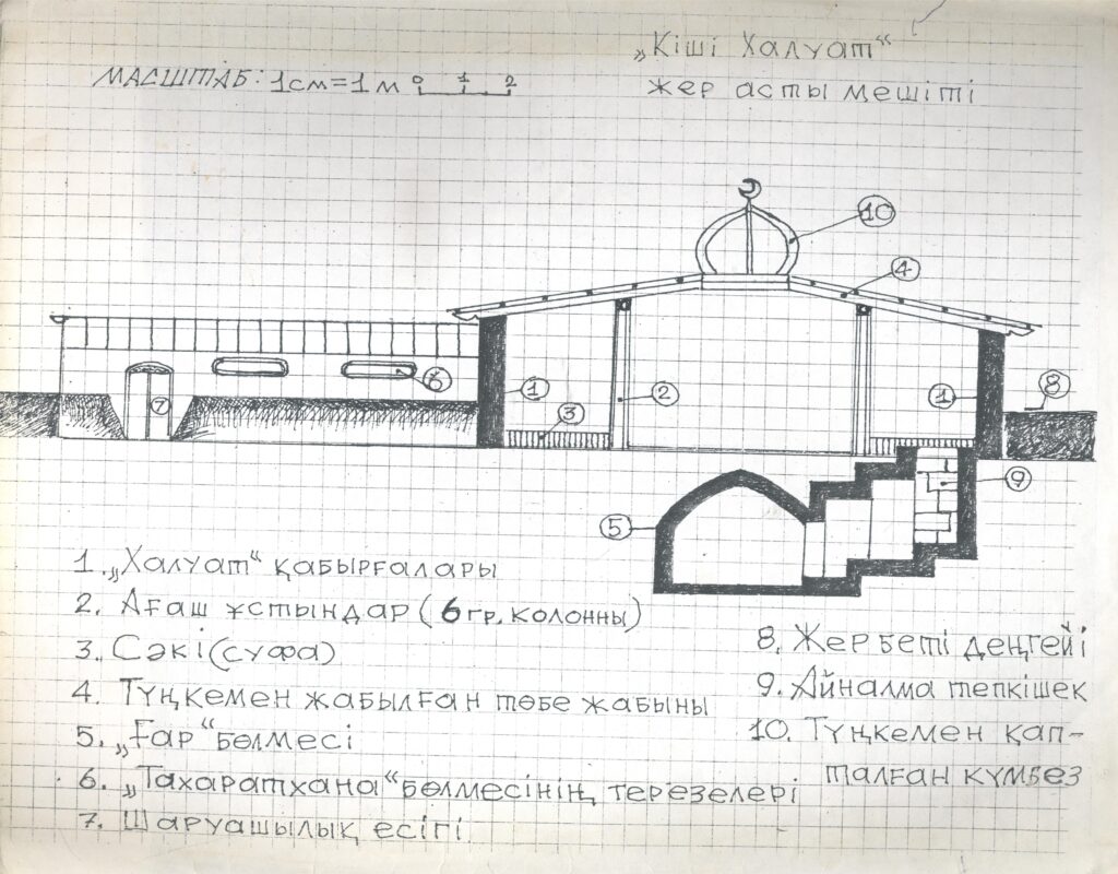 T.N. Senigova states the following in her work: «Maly Kyluet is located 50-60 meters from the Khoja Ahmed Yasawi Mausoleum. In plan, it was a rectangular structure made of baked clay, 12 m in diameter, in the form of a circle. Traces of numerous repairs have been preserved, its thick walls are installed 1 meter below ground level. The conical roof, which has undergone numerous repairs, is covered with an onion dome, decorated at the top with an ornament in the form of a crescent. The lower end of the roof rafters is above the clay wall, and the middle of the roof is installed on hexagonal wooden pillars. The pillars supporting the roof are located in a circle at a distance of 2-2.5 meters from the wall to the center. Along the wall of the room there is a trestle bed, 2.5 m wide, 30-40 cm high. of the building. This staircase leads to the Gar room, located 3 m underground. The Gar room measures 3 x 3 m and the walls are made of baked clay.