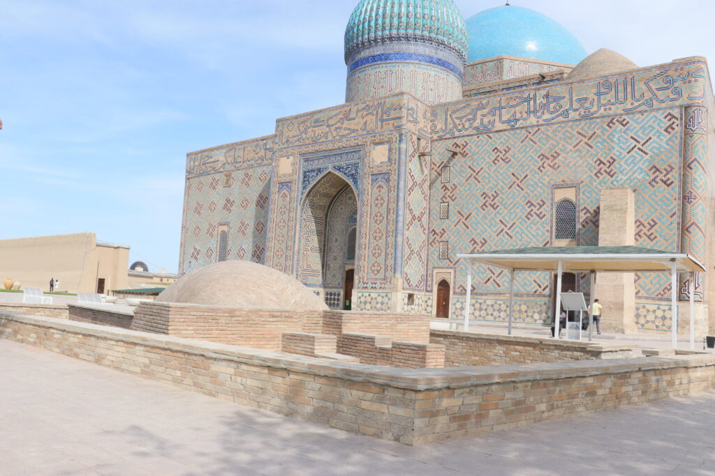 The structure is located 22 meters northwest of the Mausoleum of Khoja Ahmed Yasawi. It is a monument of republican significance. Coordinates: 43˚17.864΄, 068˚16.220΄. The word “Shildekhana” derives from the Persian “chehel”-“forty” and “khana” “house, room”, which together mean “the house where forty days are spent”. In 1958, a researcher N. B. Nemtseva was first investigate this religious and spiritual structure by the decision of the Council of Ministers of the Uzbek SSR, and was studied again in 1972–1973 by the Kazakhstani archaeologist T. N. Senigova, who obtained new data. During the first excavations, two stratigraphic trenches were laid along the eastern and western walls. Based on the results, it was concluded that the Shildekhana had been built in the 11th century. The excavations also uncovered walls preserved to human height, remnants of arches on all four sides, and the entrance doorway. However, the interior of the structure was filled with a layer of earth containing human and animal bones as well as fragments of bricks and pottery, and was therefore not studied at that time. This task was carried out during the repeated excavations of 1972–1973. The excavation measured 12 x 12 m and was located 22 m north of the mausoleum. After the 1958 works, the site was reburied, with construction debris from restoration works dumped into it: brick fragments, alabaster, lime, sand, stones, and clay. The southeastern wall was identified only with considerable effort; it was 1 to 1.1 meters thick. The bricks were laid with clay mortar, their dimensions being 25 x 25 x 5 cm and 26 x 26 x 5 cm. The interior of the wall was covered with a thick (2.5–3 cm) layer of alabaster plaster (gypsum). It gradually became clear that the building had a rectangular plan, measuring 6.78 x 5.04 m, with preserved walls up to 1 m in height. It is oriented west to east. In the corners of the rectangle were pylons, 95 cm wide and 1 m thick (vertical supports holding the arches on two sides). A dome rested on four arches. In 1958, the height of the western and eastern walls was 2.37 m, while the southern wall reached 1.96 m. At that time, the dome still rose 30–40 cm, but by 1973, this part had already collapsed. In the center of the western wall, was found a doorway 1.06 m wide, designed as a corridor 3 m long, which ending with a step leading outside and the threshold of the entrance door.
