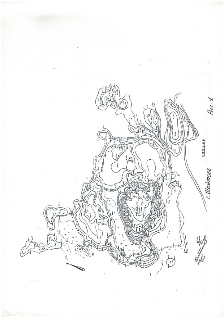 The name “Shoitobe” derives from the Oghuz tribe “Shoy.” Coordinates: 43˚14.451΄, 068˚17.622΄. Within the Turkistan oasis, several cities are known whose names are connected with Oghuz tribes: Qarnuq — Qarnaq; Qarajuk — Qarashyk; Baiyldur — Baiyldyr; Qayi — Urankay; Oqli — Okshy; Tekin — Teke; Shoy — Shoitobe, as well as Shoitobe I, II, and the Shoimola mazar. In neighboring areas there are also cities associated with the Oghuz: Zhavuldur — Shauyldir; Murde — Murde; Qazghurt — Qazyghurt; Turbatly — Turbat, and others. Archaeological excavations carried out during the Soviet period dated the upper cultural layer of the city to the 9th–10th centuries, while surface finds were attributed to the 11th–12th centuries. However, research conducted by the Turkistan Archaeological Expedition in 1996–1999 proved that the later period of the city’s existence corresponded to the early 13th century. Studies of the Otrar oasis cities have shown that cultural layers of settlements abandoned 800–1000 years ago gradually erode: the upper construction horizons, about 1–1.5 meters thick, disappear as a result of natural erosion. For centuries, rainfall and melt water washed away the remains of the last structures, turning them into clay and carrying them to the foot of the hill. Strong winds (Arystandy-Karabass), which blow for weeks, removed sand formed from the ruins of buildings, causing the mound to gradually decrease in height. Coins and ceramic fragments preserved within the cultural layers eventually sink lower, reaching horizons of later centuries. Because of this, archaeologists often face difficulties in precisely dating artifacts found in the upper layers. In the case of “Shoitobe,” prior to the 1996–1999 excavations, numerous finds were collected from the surface and even from ravines, including painted ceramics discovered already in the first spade layer, which were dated to the 13th century, as previously confirmed.