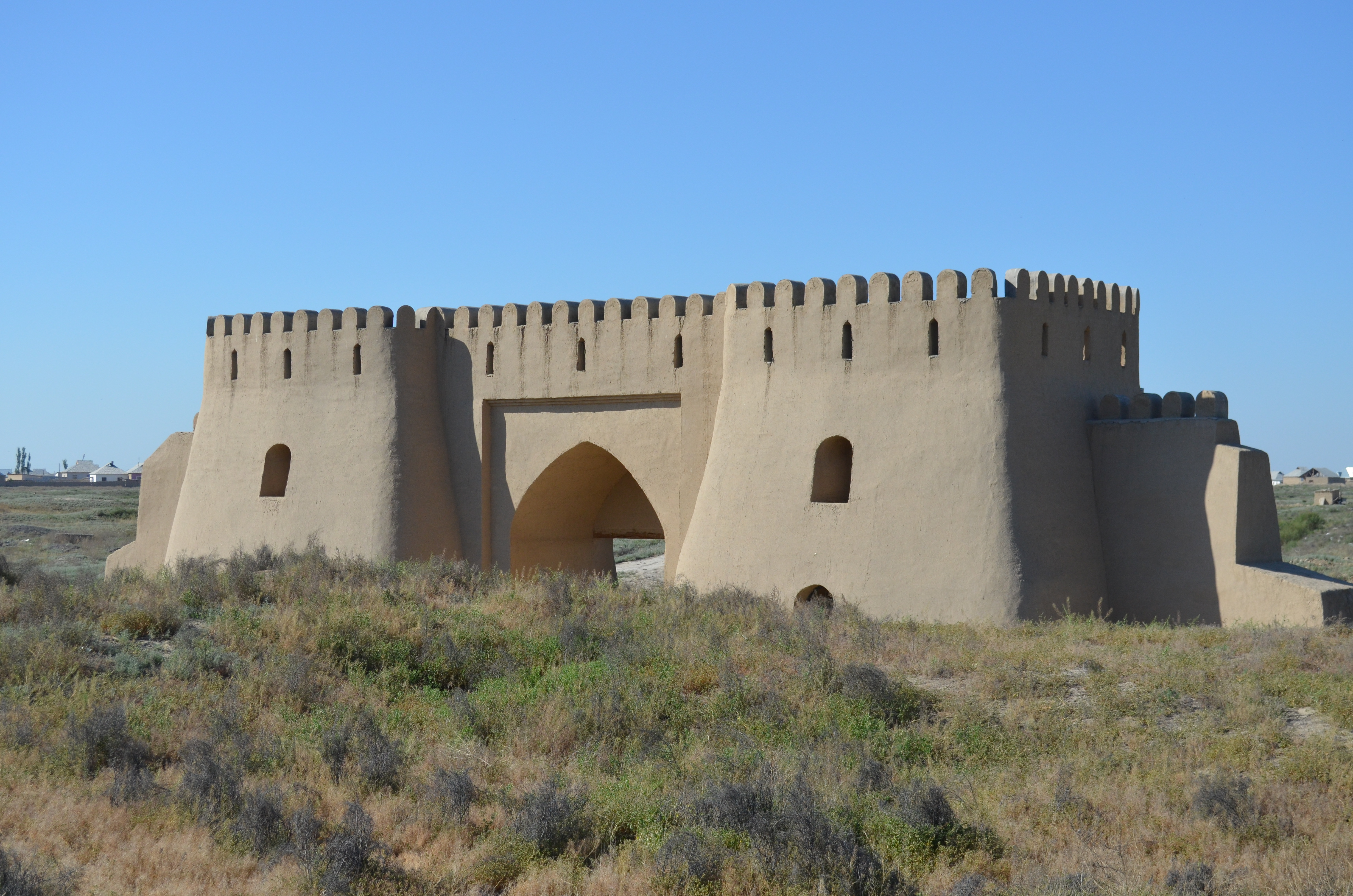 The gate Takia is located 800 m from the mausoleum of Khoja Ahmed Yasawi. Coordinates: 43.2928147, 068.2660778. These gates, called “Takiya” or “Ishan”, are marked on a map of 1864, which indicates that they were situated to the southwest of the city and surrounded by a moat filled with water. Information about the gates was collected during the excavations of the Turkestan Archaeological Expedition in 2009. A distinctive feature of the gate is that its towers are not round but quadrangular. Moreover, the corners of the towers are not sharp but rounded. The towers of the gate built in square or rectangular form are also found in earlier periods. For example, in the city of Begram in northern Afghanistan, the towers were rectangular (2nd century BCE – 4th century CE). In the city of Kampyrtepe in Uzbekistan, the towers also had square and rectangular shapes (3rd century BCE – 3rd century CE). Moreover, an ancient Nisa in Turkmenistan was completely surrounded by massive fortress walls strengthened with half-rectangular towers (3rd century BCE – 3rd century CE). Along the Syr Darya, the gates of the city of Altyn Asar had square towers, while the towers of the city of Alyp were built in the form of squares with rounded corners (1st–6th centuries). In Kulan, the castle towers were rectangular in plan at the corners and projected outward (7th–8th centuries). Similar gates are also encountered in the Late Middle Ages (15th–18th centuries). One of such gates dated to the 18th century has survived in Bukhara. Consequently, the Kokand Khanate might be employed master builders from different regions during the construction of the 3.5 km-long fortifications around Turkestan, After all, in other Uzbek cities, apart from Bukhara, gates are with quadrangular towers not found. The foundation of the gate has been preserved very well, and the additional rooms attached to the inner side and the fortress walls converging from both directions (width — 2.5 m, height — 6 m) were studied.   The name of the gate “takiya” is interpreted in the Arabic–Persian dictionary as a “place where dervishes, Sufis, and their murids gather to perform dhikr”. The well-known scholar A. Mashanov explained “takiya” as a “guest house” (for example, the “takiya” of Kunanbai in Mecca). In Arabic–Kazakh explanatory dictionary are given several meanings by N.D. Ongdasynov: 1. a dwelling for wanderers and travelers (which coincides with Mashanov’s interpretation “guest house”); 2. a residence for dervishes; 3. support, foundation. In the Tatar “Muslim Terminology Dictionary” two meanings are provided: 1. “takiya” is concealment of one’s faith in case of danger; 2. residence (monastic dwelling). In the Azerbaijani dictionary of Arabic and Persian words published in Baku, “takiya” has three meanings: 1. support, foundation; 2. gathering place for dervishes and murids to perform dhikr; 3. “takiyanshin” — one who staying in a takiya.  Therefore, although the dictionaries present different versions of meaning, the main sense is the same — “a dwelling of dervishes and murids, a place for dhikr”. Consequently, “takiya” is a type of “khilvet”, “tekke”, or “zawiya”. From this, we can conclude that by the time of the city gates construction in the 19th century (1843–1849), a structure of the “takiya” type already existed in this area, and such Sufi abode were traditionally located near mazars. In the 1952 map of Turkestan, opposite to the gates, on their eastern side, was a large “Ishan” mazar, which explains the double name of the gate — “Takia” and “Ishan”. Lets try to determine under which Kokand ruler the gates and fortress wall were built. Uzbek archaeologists believe that the 3.5 km-long fortifications and four large gates were constructed in 1843–1849. Turning to history, we see that during this period Shirali (Sherali) Khan (1842–1845) and Khudoyar (Kudayar) Khan (1845–1858) ruled Kokand. The Kokands had captured Turkestan from the Bukhara Emir under the Kazakh Khan Togai (1801–1816/20) and lost it during the reign of Aliken Khan (1858–1860).