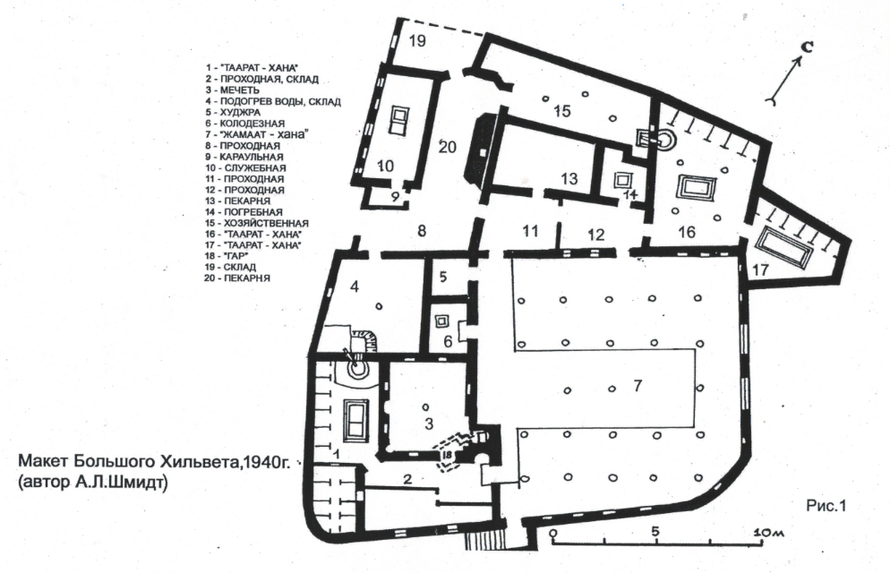 Based on the studies of T. N. Senigova and E. A. Smagulov, it was established that the construction of the khilvet occurred in two phases. The earliest part (rooms no. 1–7) was built in the 15th–17th centuries, while the northeastern sector (rooms no. 8–20) dates to the 18th–20th centuries. Only the “Ghar” chamber no. 18 (located under the room no. 3) dates back to the time of Ahmed Yasawi, i.e., the 12th century. In 1996, the Turkistan Archaeological Expedition (E. Smagulov, M. Tuyakbaev) excavated the mosque (room no. 3), beneath the floor of which lay the “Ghar”. It was revealed that the walls of the “Ghar” do not align with those of the mosque, indicating different construction periods. The walls of the “Ghar” are set at an angle of 15 degrees, placing it directly under the mosque entrance. In the original plan, the hatch leading into the “Ghar” was located outside the northeastern wall of the mosque (as confirmed by A. L. Schmidt’s 1942 model). However, during the 1980s reconstruction, northeastern wall of the mosque was shifted about one meter, and the hatch ended up inside the room.