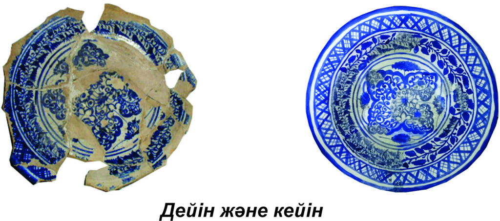 Реставрация кезінде жәдігердің ернеу жағының бөлшектері толығымен , және денесінің кей жерлерінің бөлшектері гипске пва желімі қосылып, гипс үстіне жәдігердің түсіне сәйкес бояумен (гуашь) боялып өсімдік өрнек суреті салынып,үстінен түссіз лакпен сырланып, қайта қалпына келтірілді.