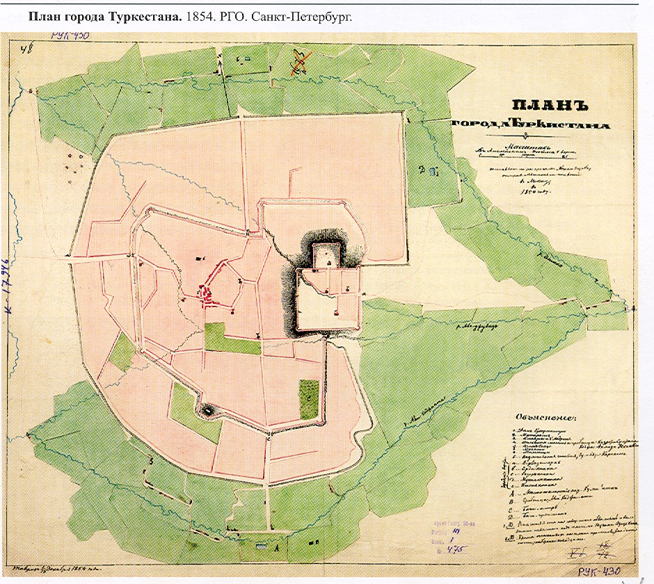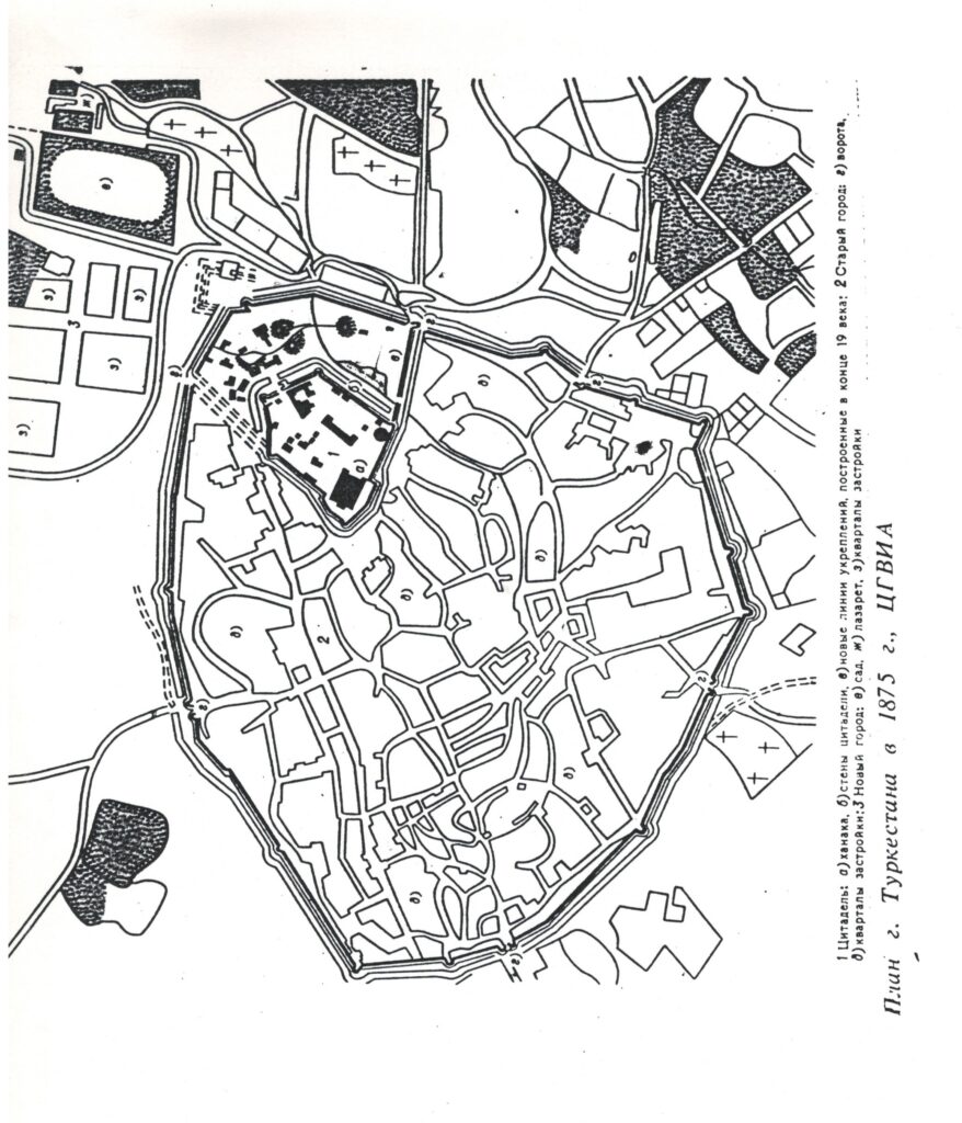 12 июня 1864 года, после захвата Туркестана русскими войсками, 15 июня распоряжением Н.А. Верёвкина городской совет управления был оставлен в прежнем виде. Согласно этому порядку, город делился на пять частей: район вокруг мавзолея назывался Мусалла (на карте — I) и передавался под управление шейх уль-ислама Насруллы ходжа Исхакова и раис Арип ходжа Абзал Кожина; оставшиеся четыре части были поручены четырём аксакалам — Жанты Утепову, Аширу Азманову, Баймамбету Калмухамбетову и Масали Болегенову. Кроме того, в состав гражданской администрации вошли азизы, накибы, казии, помощники аксакалов — всего 20 человек.