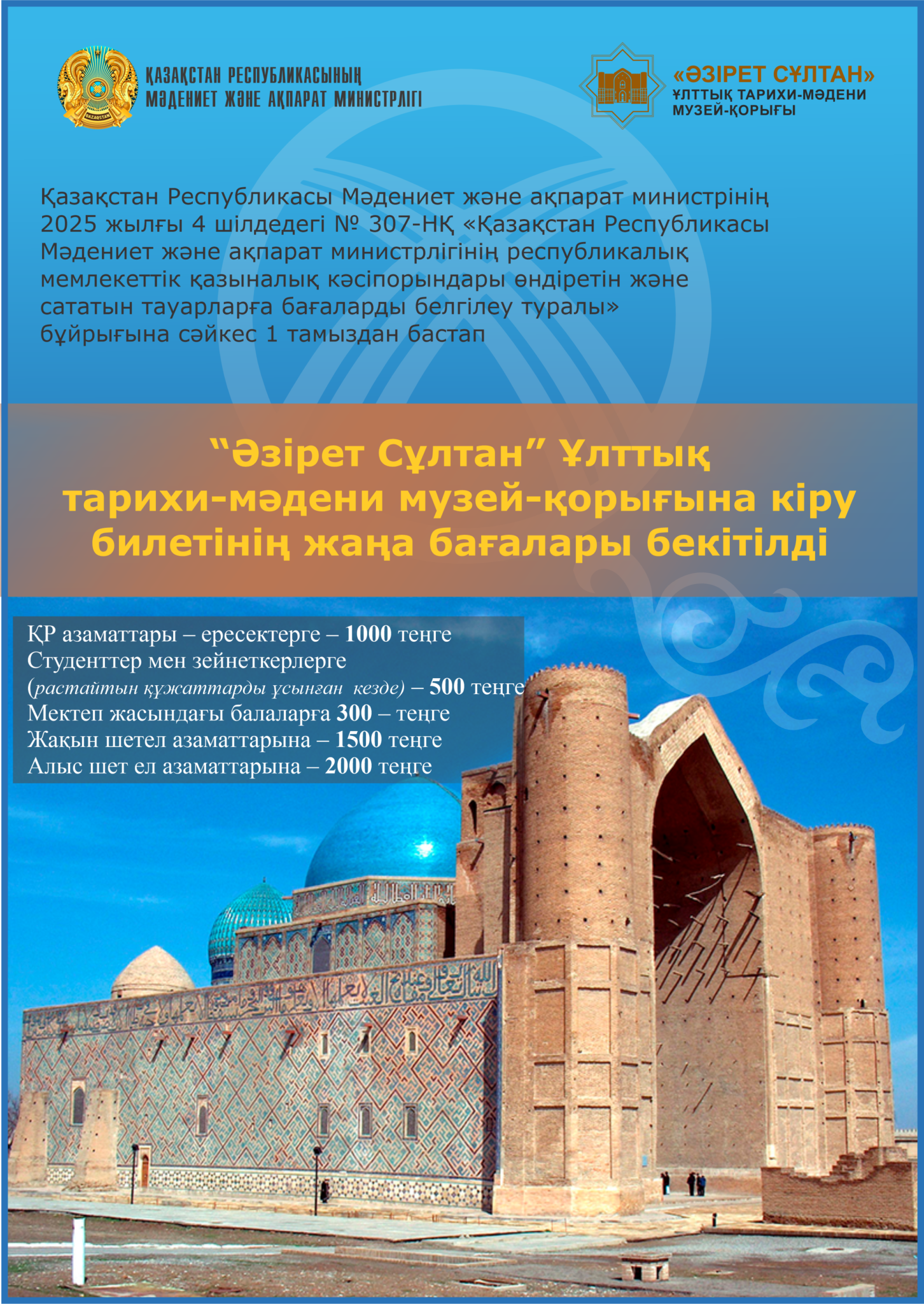 В этой связи, согласно приказу Министра культуры и информации Республики Казахстан от 4 июля 2025 года № 307-НҚ «Об установлении цен на товары (работы, услуги), производимые и реализуемые республиканскими государственными казёнными предприятиями Министерства культуры и информации Республики Казахстан», были утверждены новые цены на входные билеты в музей-заповедник: