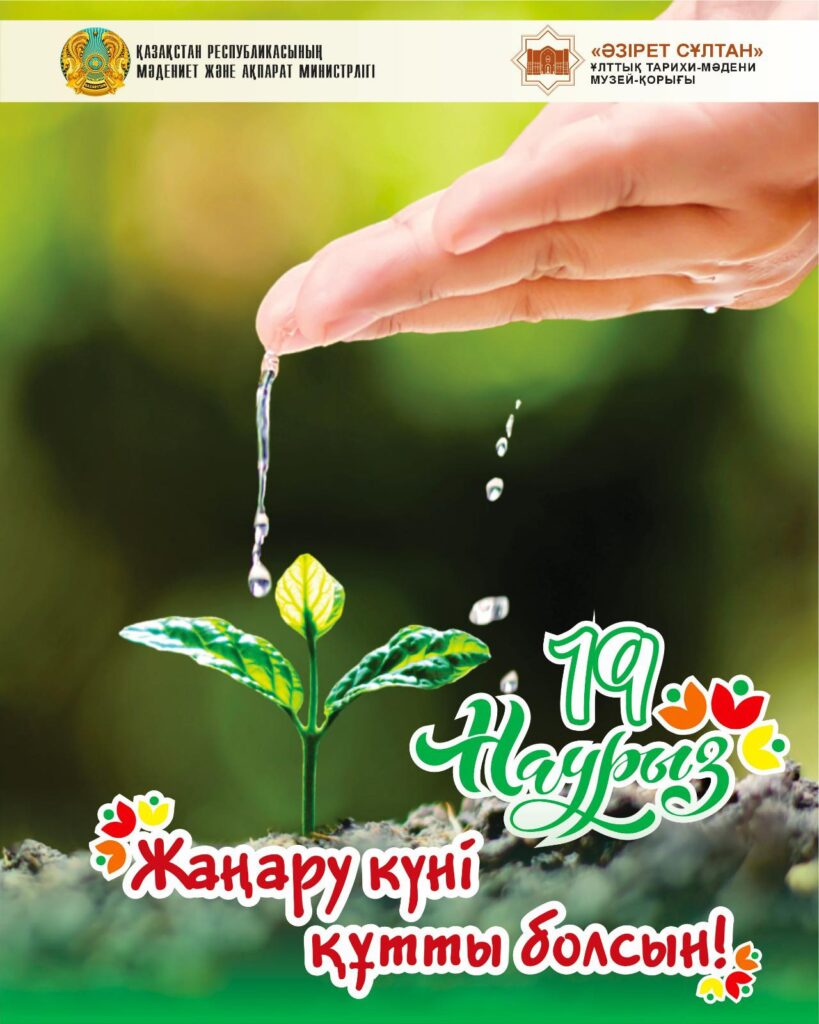 «Әзірет Сұлтан» Ұлттық тарихи-мәдени музей-қорығының ұжымы Сіздерді Ұлыстың ұлы күні – әз-Наурыз мейрамы қарсаңында өтіп жатқан «Наурызнама» онкүндігі аясындағы 19 наурыз – Жаңару күнімен шын жүректен құттықтайды!